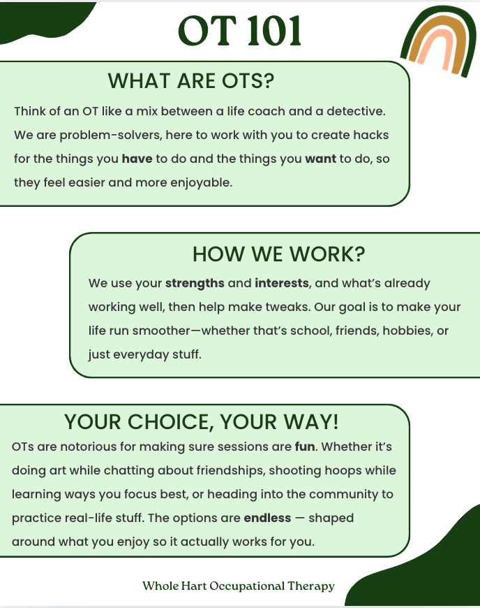 Occupational therapy supports people to engage in the activities that matter most to them. Think of us as a detective —we help crack the code behind the barriers for daily life.
